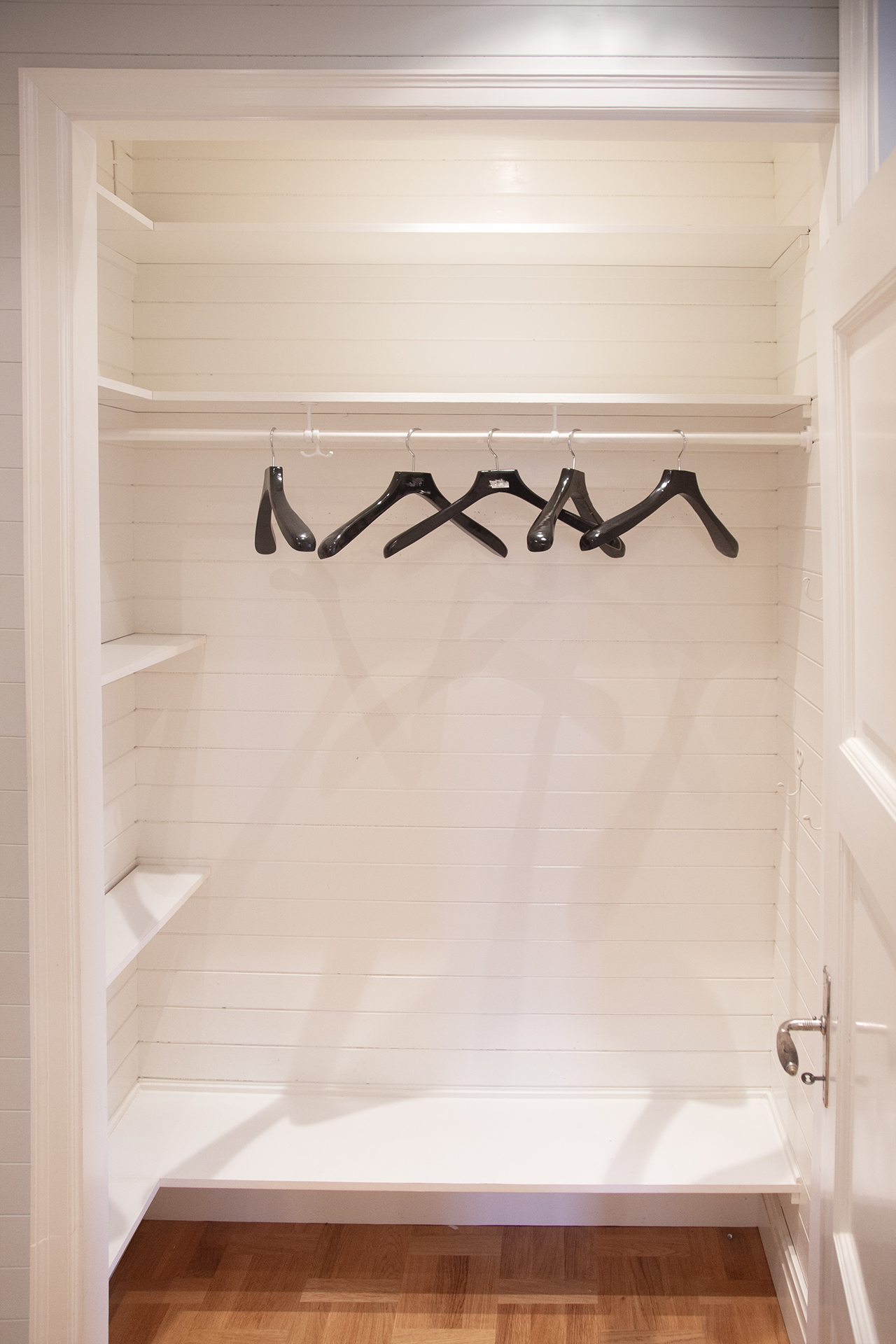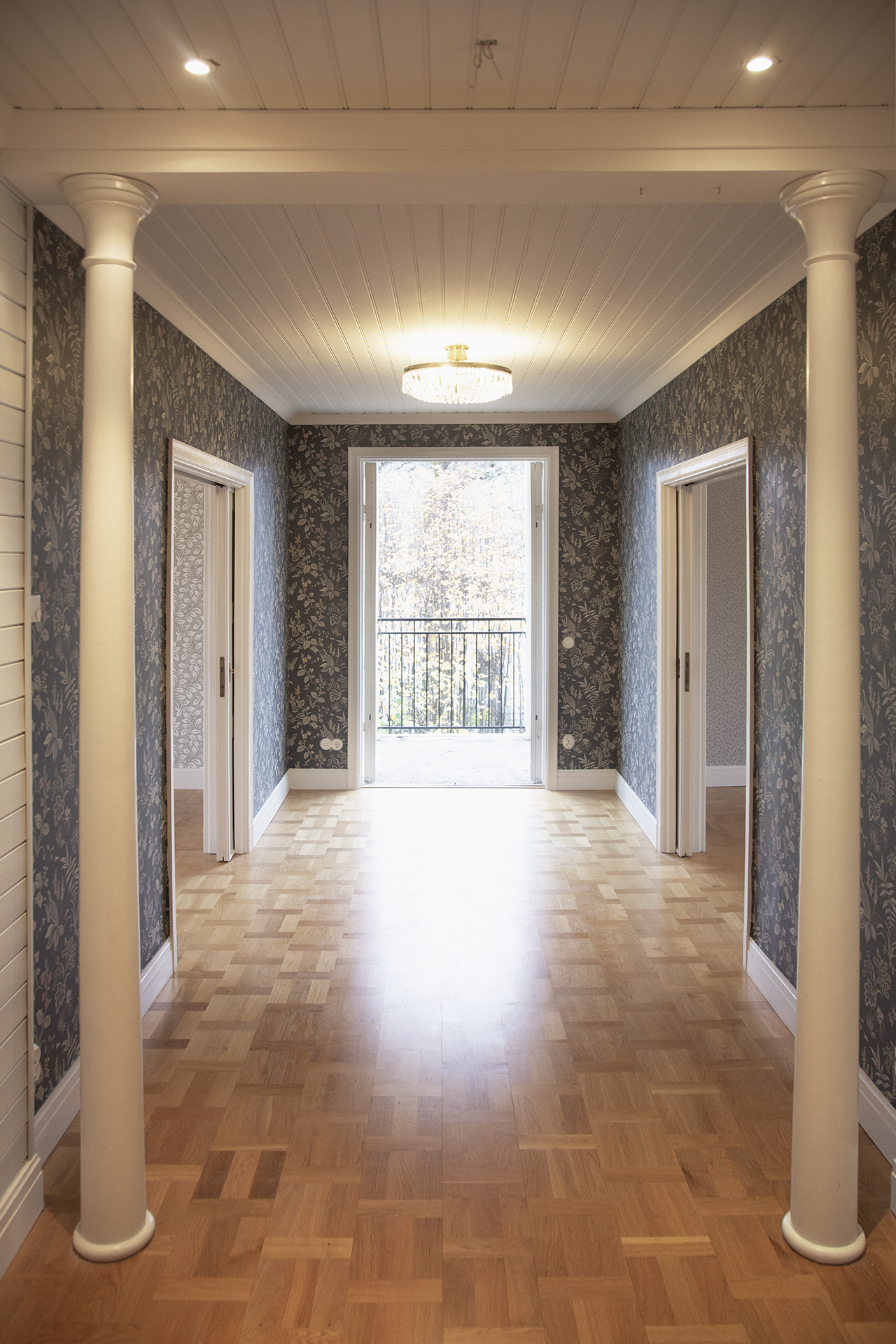 En pampig entré med väl tilltagen hall med stora skjutdörrar till de två största rummen, med möjlighet till både öppen planlösning eller stängda rum. Hallen går ut till balkongen.