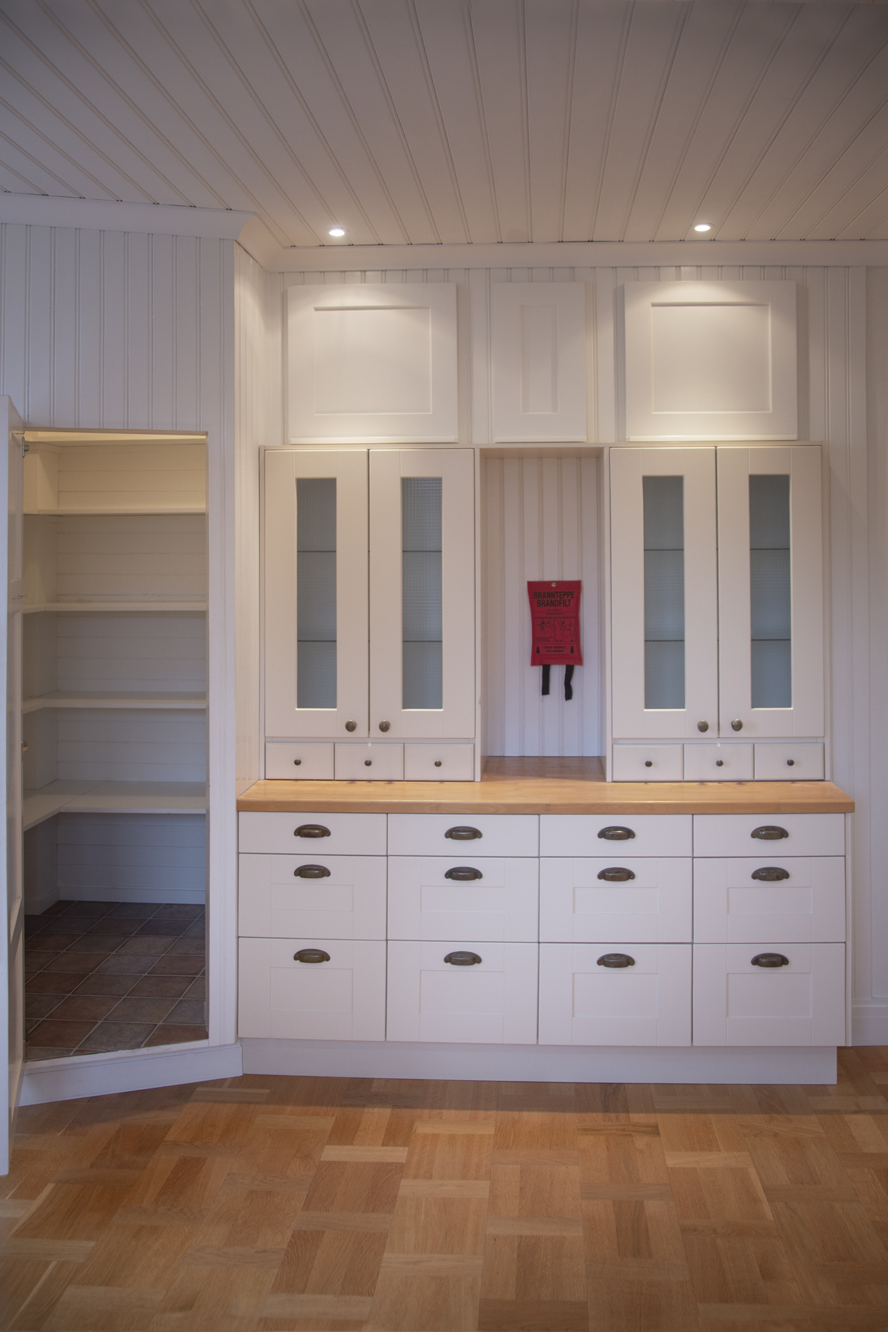 Inbyggda skåp med ett väl tilltaget matförråd.